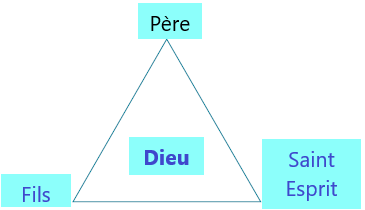 Le mystère de la Trinité (Triunité) de Dieu est insondable pour nous, les humains. Il est un seul Dieu, et pourtant le Père est Dieu autant que le Fils et que le Saint Esprit. Un faible reflet de cela est contenu dans la triple division de l’homme selon 1 Thessaloniciens 5:23 : « Et que votre esprit, votre âme et votre corps tout entiers soient conservés irréprochables lors de la venue de notre Seigneur Jésus Christ ». Ces trois « composantes » sont distinctes et pourtant forment ensemble l’homme tout entier. Un autre exemple, également imparfait, est celui de l’eau, qui apparaît sous trois états différents : à l’état liquide, à l’état solide sous forme de glace, et à l’état gazeux sous forme de vapeur. Néanmoins, il s’agit toujours de la même chose, à savoir de l’eau (nom chimique : H2O). Un troisième exemple est plus facile à représenter graphiquement :